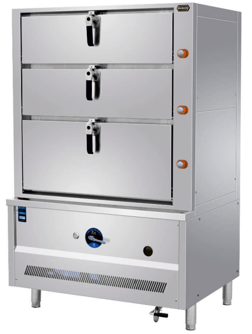 Gas steam cabinet with three decks, equipped with high-performance burners delivering a total power output of 33 kW for rapid steam generation. Each steam chamber is individually controlled with three steaming operations, ensuring an ideal balance between performance and energy efficiency when required.